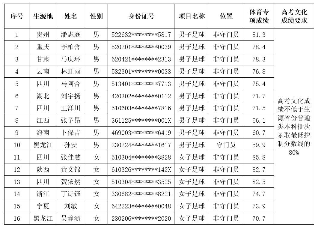 根据《教育部办公厅关于做好2024年普通高等学校部分特殊类型招生工作的通知》(教学厅﹝2023﹞10号)和《吉利学院2024年高水平运动队招生简章》等文件的要求,结合学校高水平运动队项目的建设需要,学校2024年计划招收高水平运动队足球项目20人(其中男子足球10人、女子足球10人,具体计划分布见年度高水平招生简章)。根据考生体育专项成绩,分项目、分性别、分位置从高分到低分进行排序,择优确定学校2024年高水平运动队合格考生名单,现予以公示。